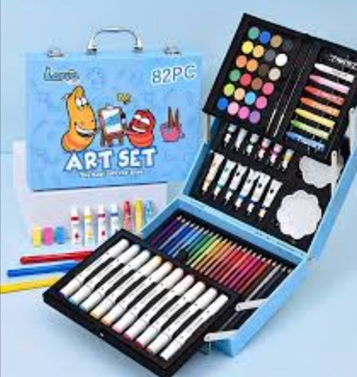 Uključuje raznovrsne bojice, flomastere, vodene boje, četkice i papir, sve upakovano u praktičnu kutiju koja olakšava organizaciju i prenosivost.