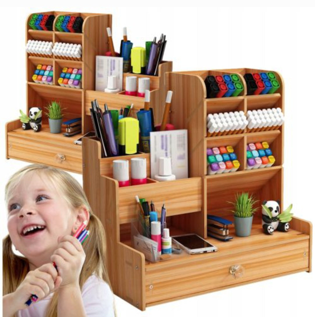 Ovaj elegantni drveni organizator za stol je idealan dodatak za održavanje reda i elegancije na vašem radnom stolu. Izrađen od čvrstog drveta, pruža trajnost i sofisticiran izgled koji će se uklopiti u bilo koji prostor, bilo da je to ured ili dječja soba. Sa više polica, ladica i pregrada, ovaj organizator nudi veliku pohranu za olovke, škare, ključeve i druge sitnice. Univerzalni dizajn čini ga savršenim dodatkom za svaku