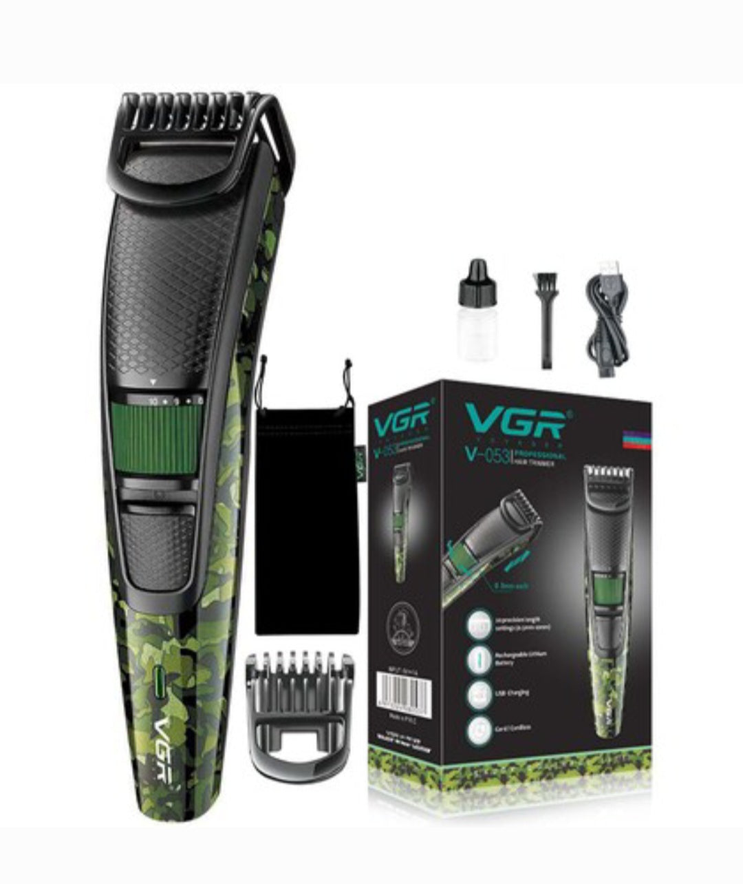 Masinica precizna za sisanje Boja ARMY - V053 Brand VGR Izvor napajanja Napaja se baterijamaMaterialStainless SteelDimenzije artikla DkŠkV18 k 12 k 5,5 centimetaraTrimer za bradu sa podesivim preciznim biranjem: 20 preciznih podešavanja dužine u koracima od 0,5 mm pružaju vrhunsku kontrolu i preciznost na svim dužinama brade. Trim čisto i brzo: Snažni 5V motor koji radi sa ultra-oštrim sečivom od nerđajućeg čelika  čini čisto i brzo sečenje. Precizna i oštra sečiva od nerđajućeg čelika: Oštra sečiva od nerđajućeg čelika visoke tvrdoće su otpornija na habanje, izdržljivija, što može ponuditi vrhunsku brzinu i održati dugotrajnu oštrinu. Litijumska baterija velikog kapaciteta: Potpuno punjenje za 2 hRS, litijumska baterija od 500 mAh koja se brzo puni može da isporuči snažnu snagu do 90 minuta rada.
