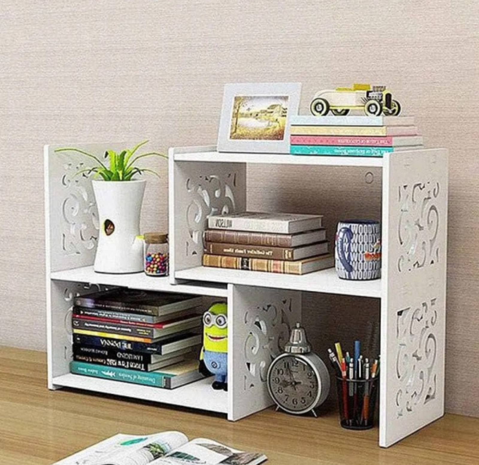 Ova elegantna i praktična polica savršena je za organizaciju knjiga, sveski, ukrasa i kancelarijskog pribora. Izrađena od kvalitetnog materijala sa dekorativnim rezbarijama, idealno se uklapa u radni sto, dečiju sobu ili kancelariju. Polica sadrži više pregrada koje omogućavaju pregledno skladištenje i istovremeno štede prostor.
