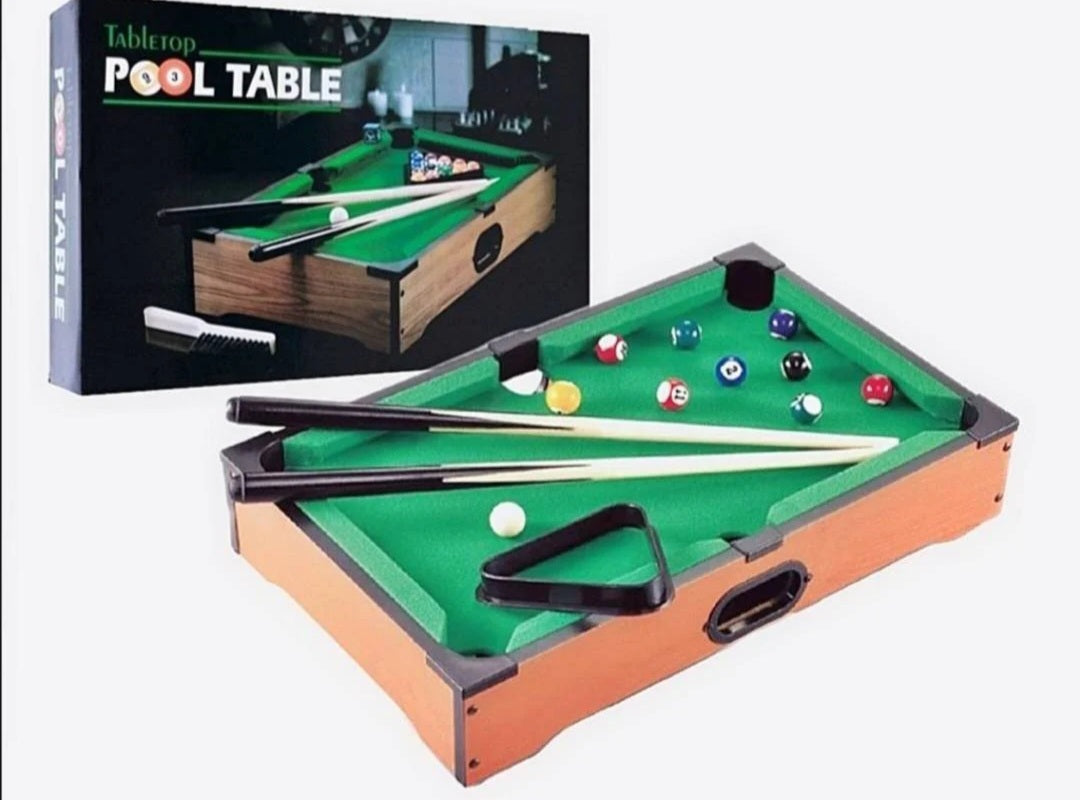 Komplet sadrži dva drvena bilijarska štapa, bilijar kugle, četku za održavanje zelene podloge po kojoj se igra, graničnik za kugle.