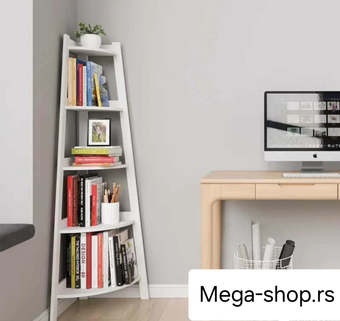 Praktična i moderna bela ugaona polica sa 5 nivoa – savršena za knjige, biljke, dekoraciju i sitnice! Dimenzije: